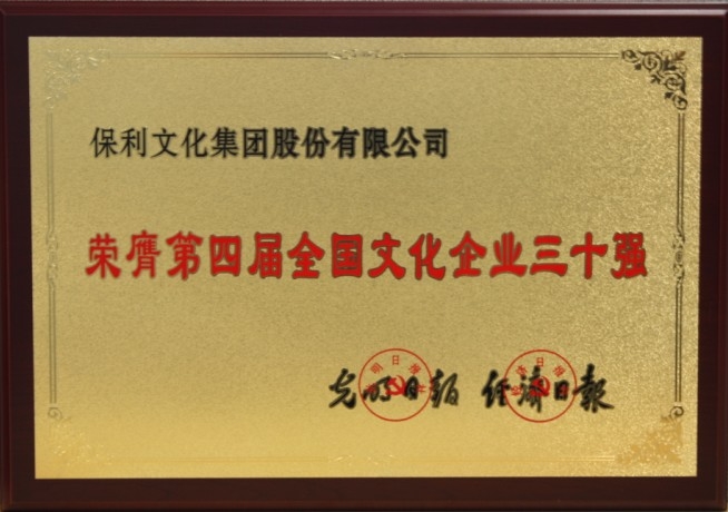 保利文化集团股份有限公司2004年被文化部命名为“文化产业示范基地”;2011年被文化部授予“十大最具影响力国家文化产业示范基地”称号;2008年、2010年和2011年连续三届入选“文化企业30强”。在第四届的“文化企业30强”评选中,保利文化再度入选并蝉联文化艺术类第一名,进一步确立了在中国文化企业第一阵营中的重要地位,提升了品牌美誉度和社会影响力,为实现跨越式发展打下了坚实的基础。